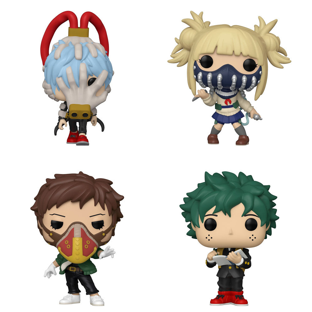 - Four detailed Funko POP! vinyl figures: Shigaraki, Himiko Toga w/ Face Cover, Kai Chisaki (Overhaul), and Deku in Middle School Uniform.