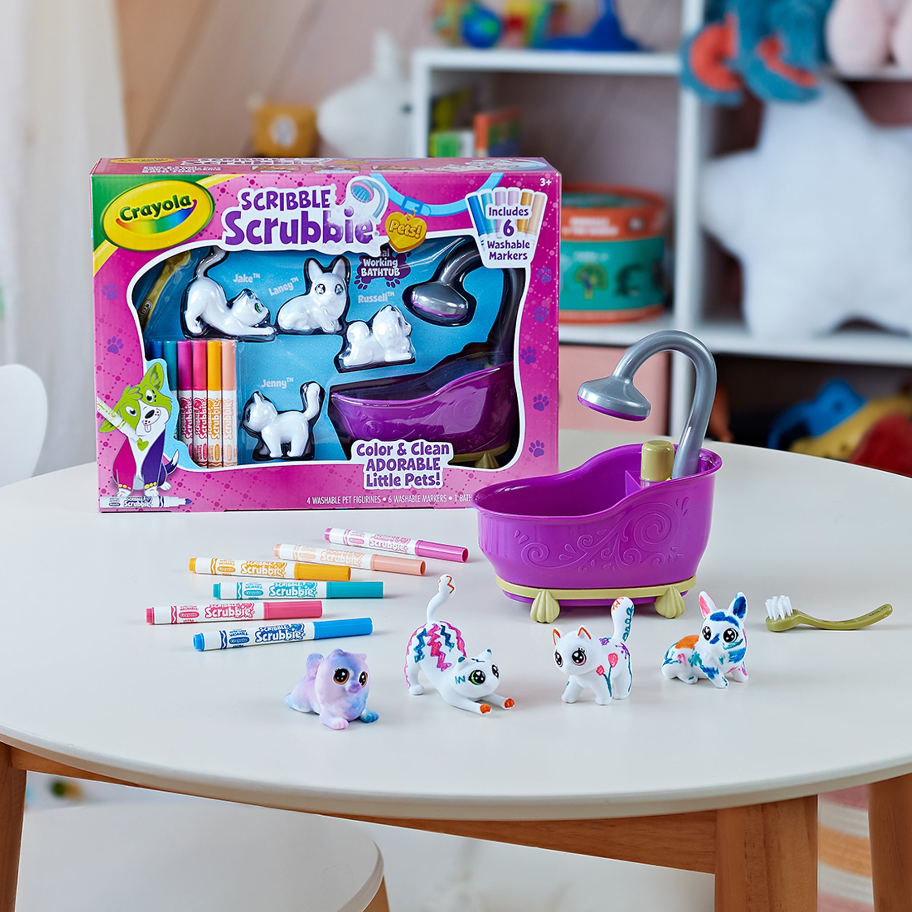 Splish, splash, and scribble your way to fun with the Crayola Scribble Scrubbie Pets! Bathtub. This whimsical set transforms coloring from flat to fabulous by letting kids color, wash, and recolor their petite pet figurines. With 6 vibrant washable markers, little artists can decorate their choice of a dog, cat, or bunny, then give them a bath in the delightful kid-powered purple tub to start all over again!