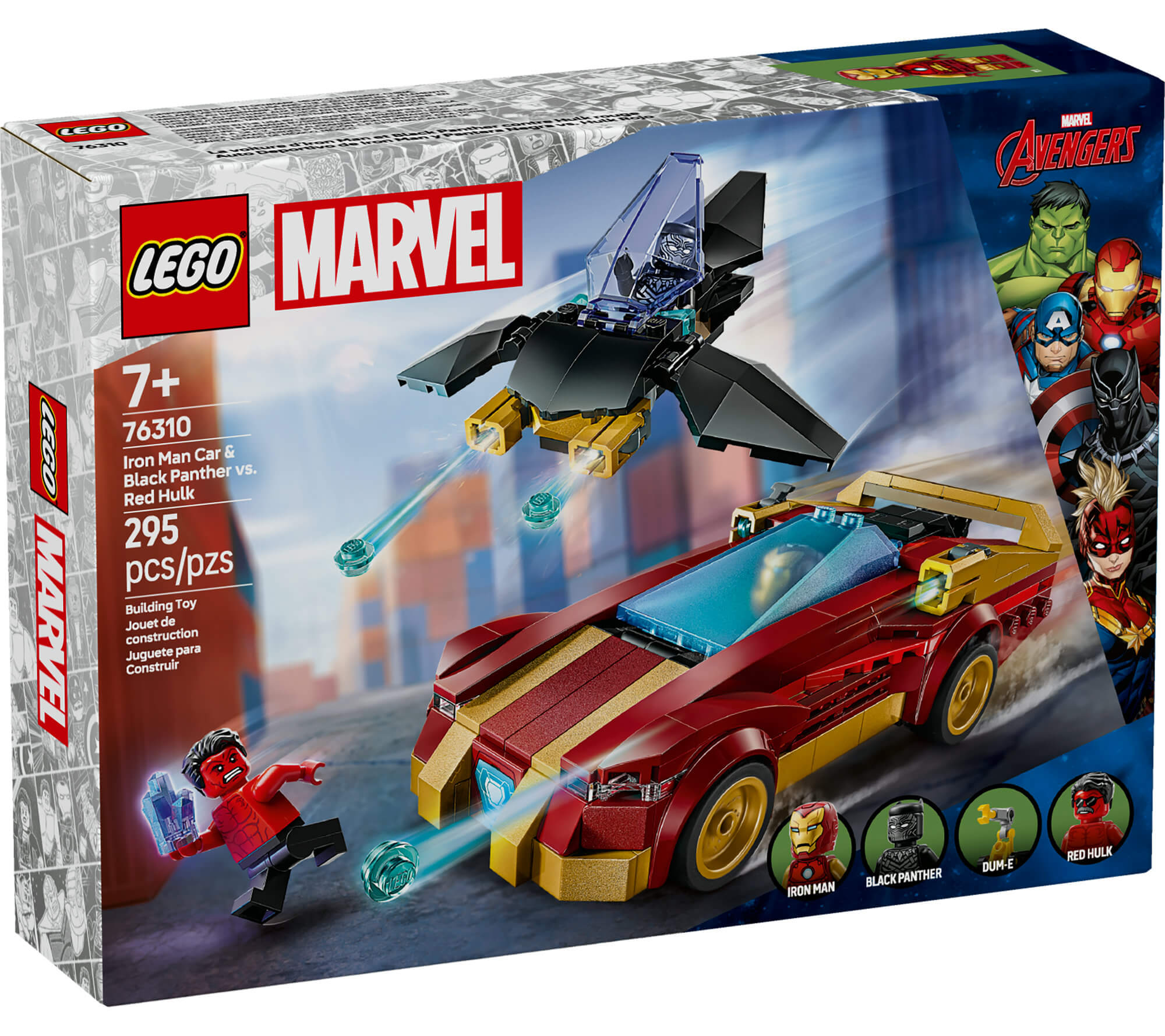 Includes iconic Iron Man, Black Panther, and Red Hulk minifigures.