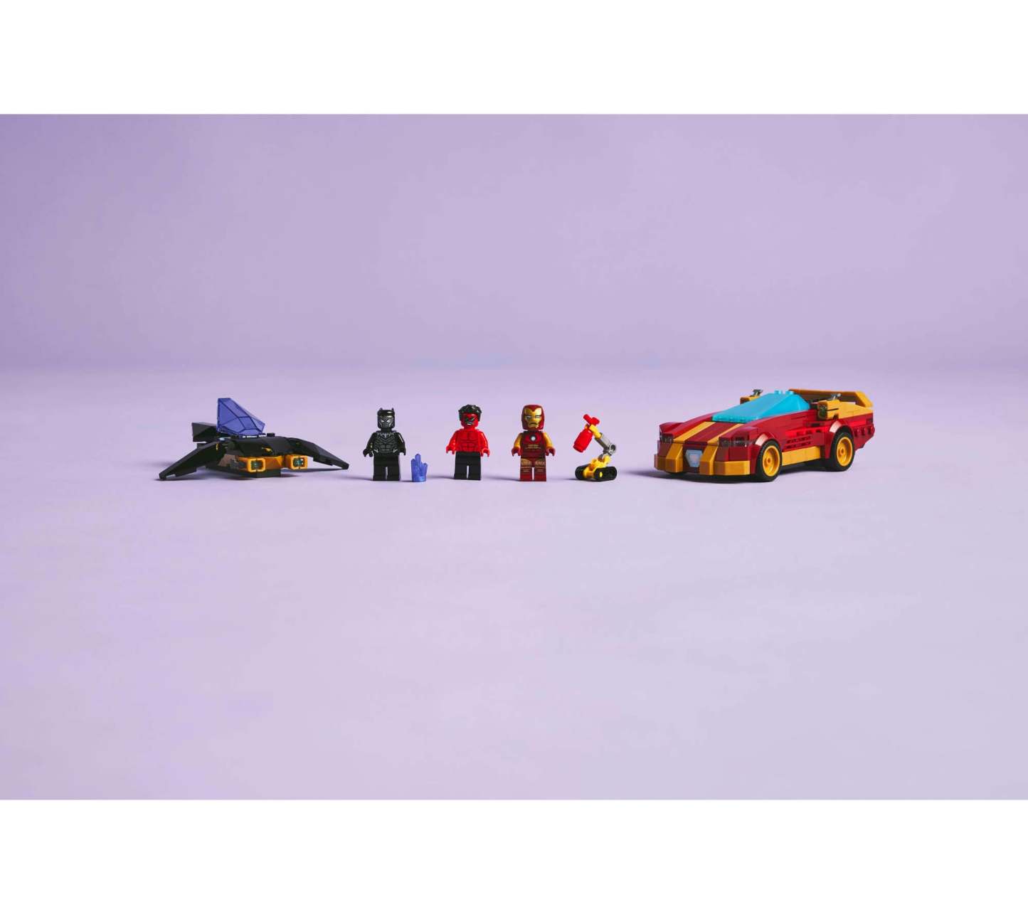 Features Iron Man's high-tech car and Black Panther's stud-shooting aircraft.
