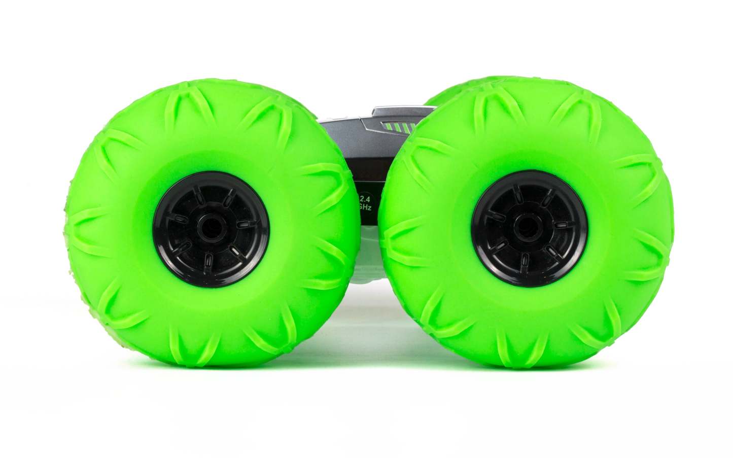 Whirl and twirl your way to adventure with the EXOST 360 TORNADO - Green, a robust 1:10 scale radio-controlled monster truck that promises adrenaline-pumping action. This durable vehicle features a double-sided body and revolutionary inflatable tires, making it a powerhouse for 360-degree stunts and high-speed races. Equipped with a 2.4Ghz control system, it allows for competitive racing with up to 10 players. The shock-absorbing, all-terrain tires ensure smooth rides across challenging surfaces, while the included air pump keeps the action going for up to 40 minutes of playtime. Prepare for a thrilling RC experience with every twist and turn!